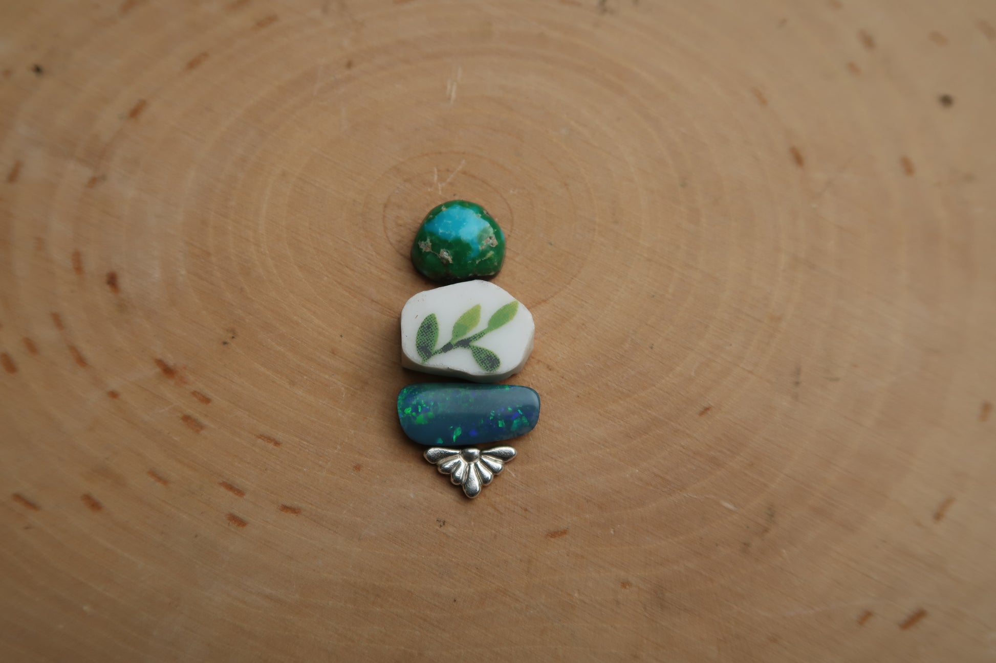 An earthy turquoise and opal paired with a ceramic piece I cut out from a plate! set in sterling silver on a plain sterling silver band made in your size!