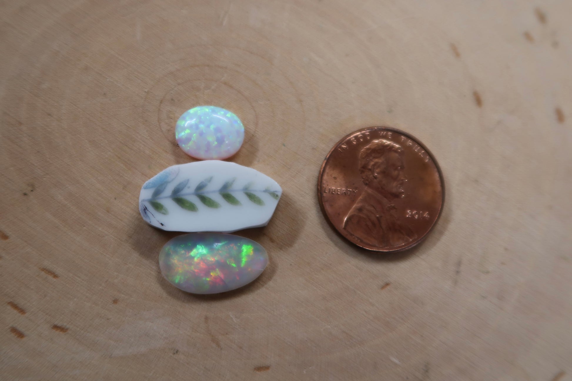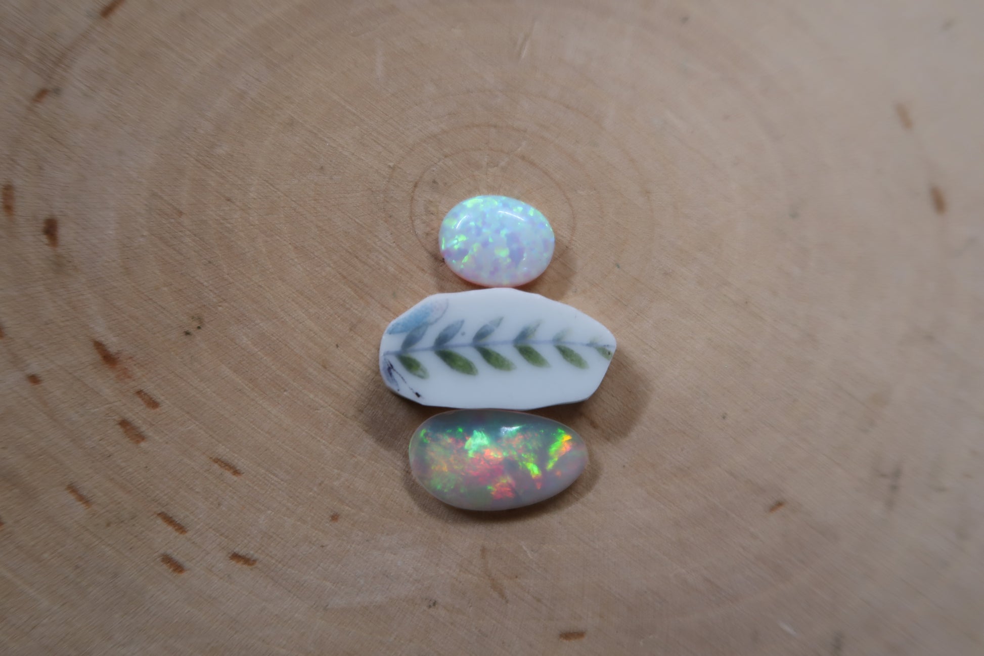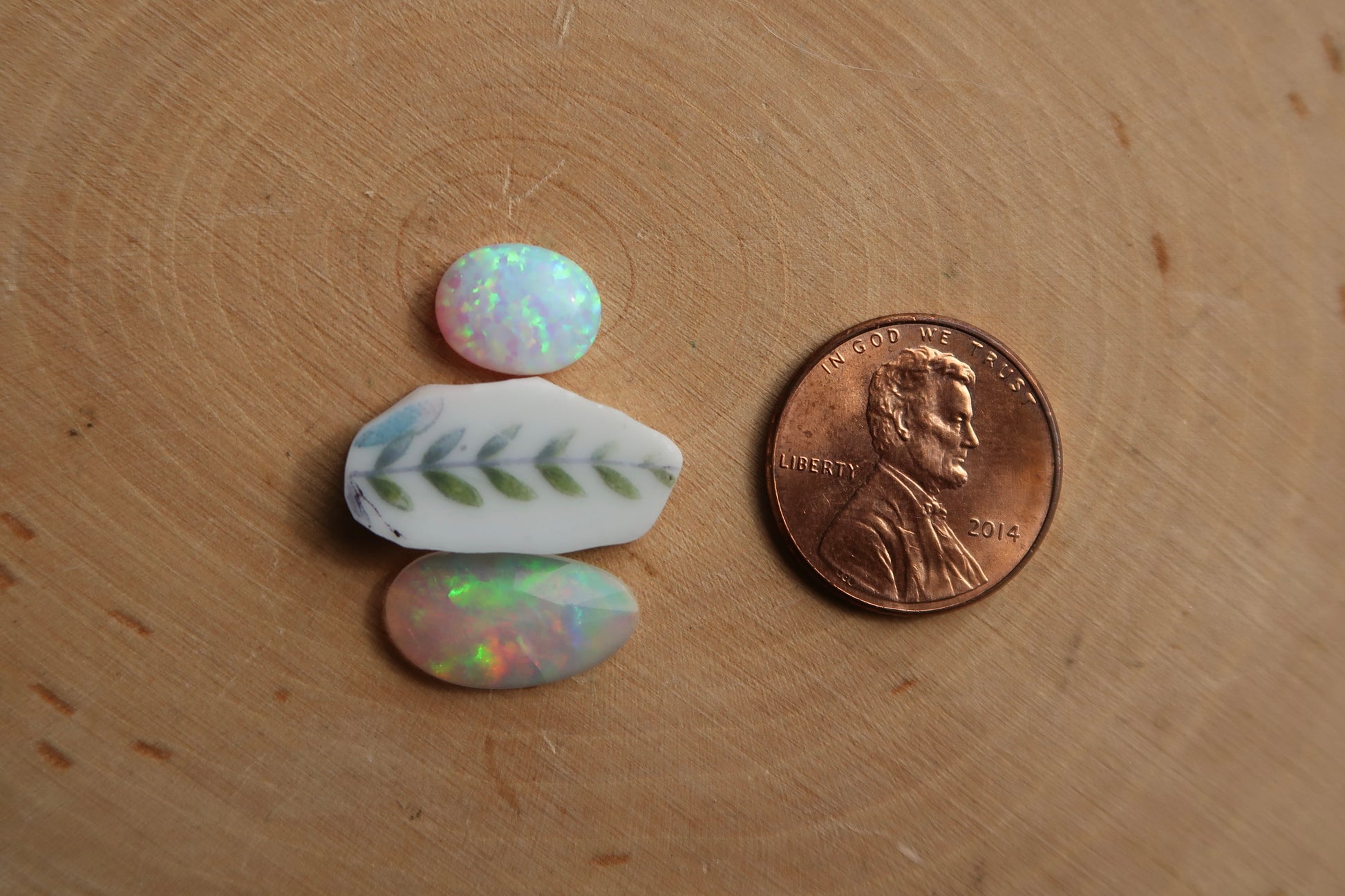 Become mesmerized by all the incredible flashes of colors in this Ethiopian opal paired with a ceramic leaf I cut and shaped from a vintage plate set in sterling silver on a plain sterling silver band made in your size!