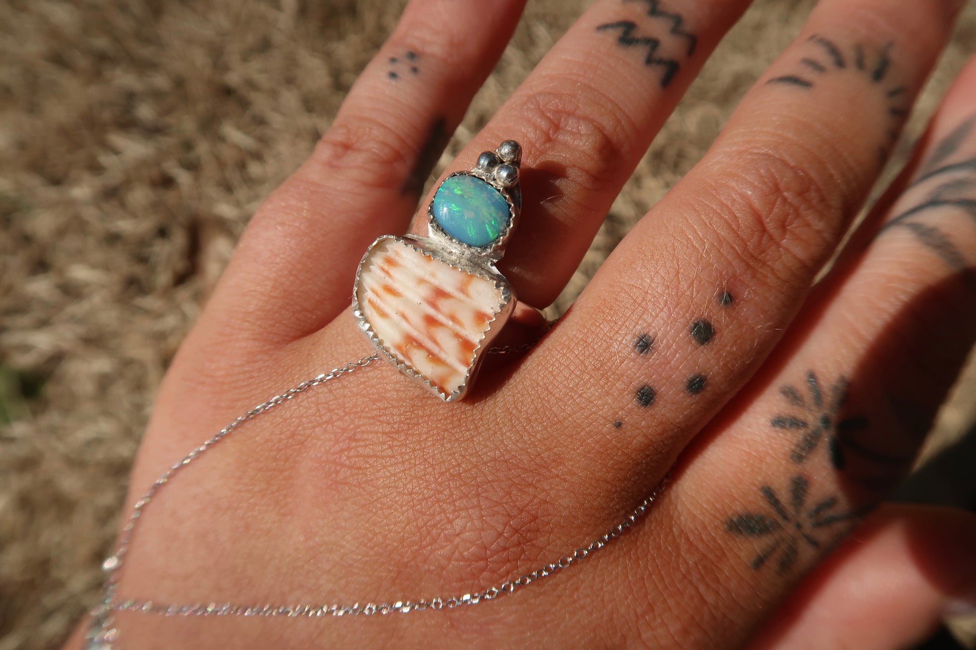 Coober pedy opal with piece of scallop shell from the Virgin Islands on a plain sterling silver band size 6!