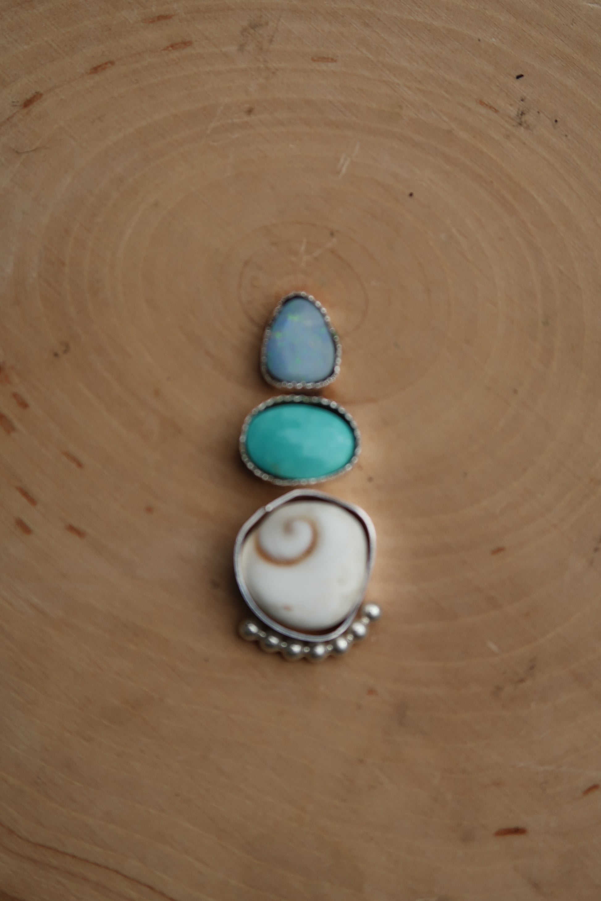 A beautiful opal and turquoise paired with a shiva eye shell from Florida! set in sterling silver on a plain sterling silver band made in your size!