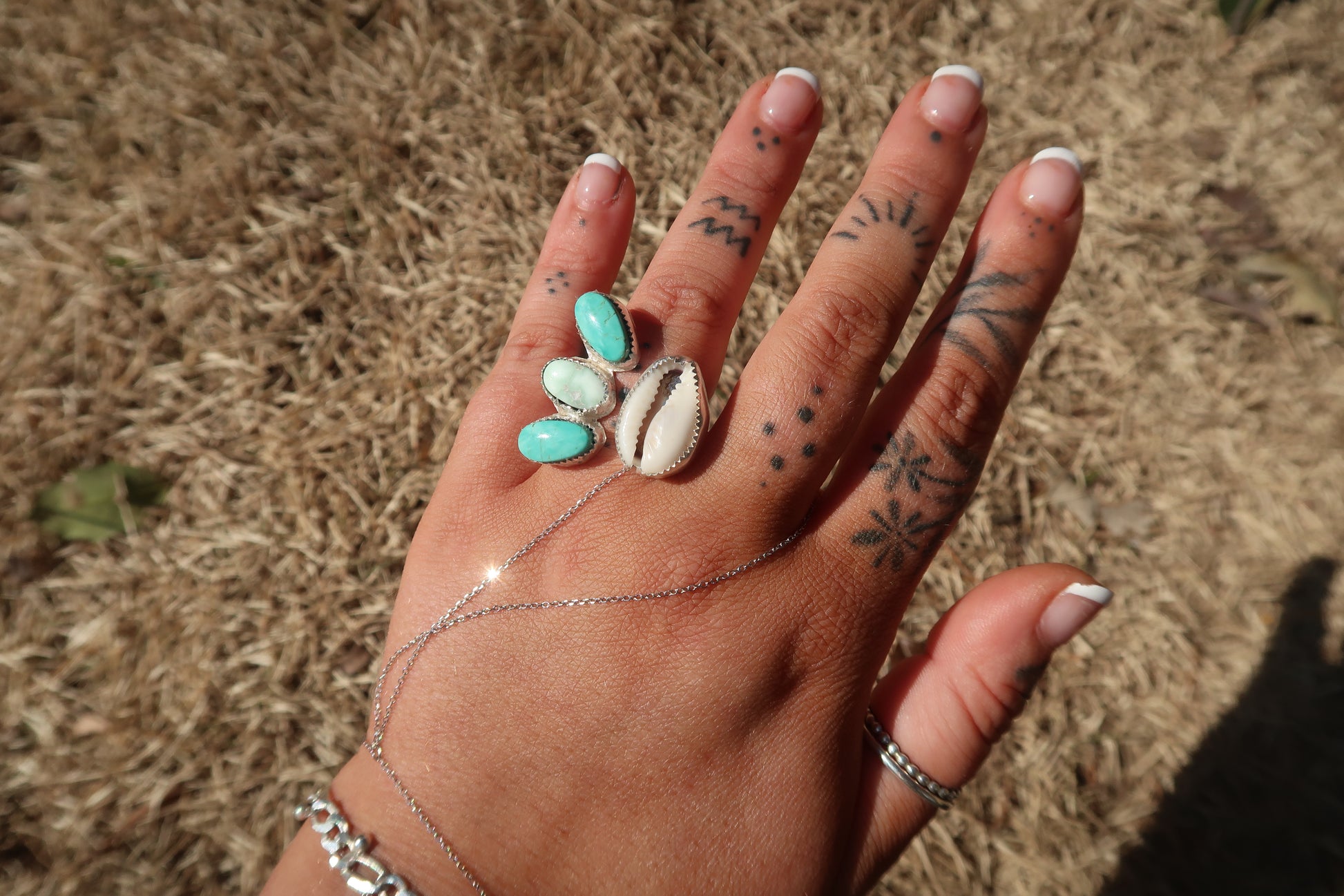 Size 5 but adjustable open shank with turquoise, variscite and cowrie shell! The perfect combo ! <3