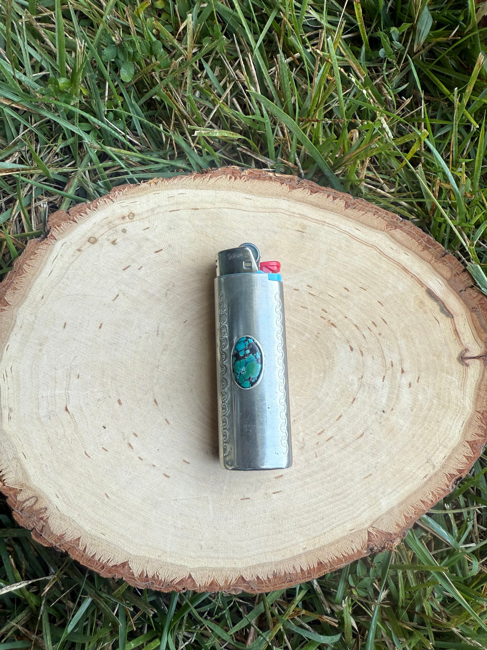 Hubei turquoise set in fine silver on a nickel lighter case